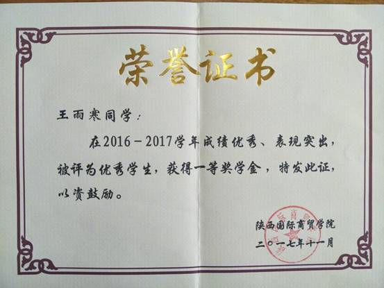 2016—2017学年“优秀学生一奖学金”获得者 我院国际经济与贸易B1502班 王雨寒