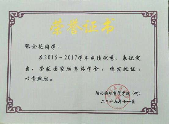 2016—2017学年“国家励志奖学金”获得者 我院国际经济与贸易B1403班 张金艳
