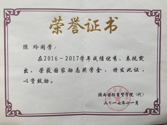 陈玲,女,共青团员,陕西商洛人,就读于我院国际经济与贸易专业B1501班。2015年9月入学以来,先后荣获学校第三届创新创业比赛金奖,2017年(新加坡)全球品牌策划大赛中国地区选拔赛一等奖,全国大学生英语竞赛C类二等奖,全国第八届大学生数学竞赛二等奖、第十一届西安高新“挑战杯”陕西省大学生课外学术科技作品竞赛三等奖;考取了大学英语四级、计算机二级等职业资格证书;2016—2017学年获得“国家励志奖学金”。