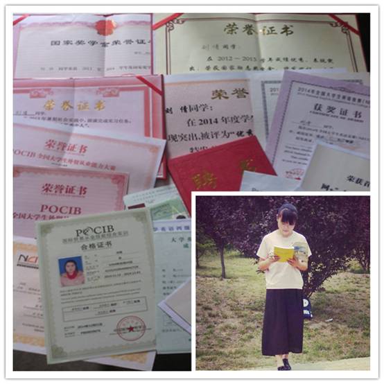 刘倩,女,河南信阳市商城人,中共预备党员。我院国际经济与贸易专业2016届毕业生。曾任班级组织委员和教学信息员,先后荣获学校“国家奖学金”、“国家励志奖学金”、“暑期大学生社会实践先进个人”、“优秀学生教学信息员”等;2014年获得全国大学生POCIB外贸从业能力大赛“个人三等奖”、“团体三等奖”;连续两年获得全国大学生英语竞赛C组类二等奖和三等奖;2015年所在团队的“周末地主”休闲农业项目,荣获首届中国“互联网+”创新创业大赛陕西赛区银奖;在校四年期间分别考取了全国会计从业资格证书;二级市场营销LCCI证书;全国计算机二级“VFP数据库程序设计”合格证书;国际贸易从业技能综合实训合格证书;大学英语四级证书和大学英语六级证书;中华人民共和国机动车驾驶证;并在2013年和2015年暑期分别对咸阳的非正规小微企业和陕西物流发展现状进行实地调研并完成两篇调研报告。