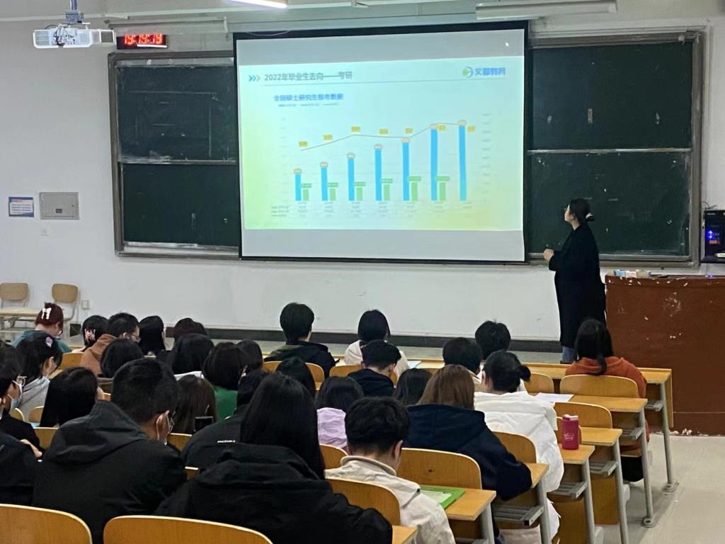紧接着,文都考研金牌指导老师赵逸兰为同学们做了考研指导,她从“考研形式解读”“备考指导”“招生情况解读”三个方面以及学生比较关心的系列问题进行了多角度讲解,并从近几年考研情况出发,进一步分析了近期考研录取情况,深刻阐述了考研的重要性,帮助同学们树立正确的考研观念。同时,就2024届考研关键时间节点、报考流程、信息获取等相关内容进行了详细解答,强调了备考的重要时间节点,引导同学们充分做好备考计划和进度安排。并对参会学生提出的问题进行了一一解答。