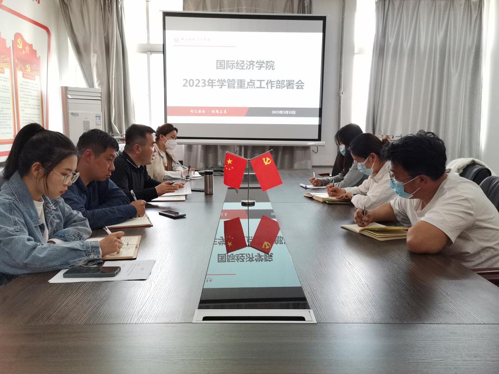 为深入学习传达学校2023年学生工作会议精神,落实相关工作部署,切实明确新学期工作重点,进一步提升学生管理实效,3月10日下午,国际经济学院组织召开2023年学管重点工作部署会。学院全体学管人员参加会议,党总支副书记荣超主持会议。