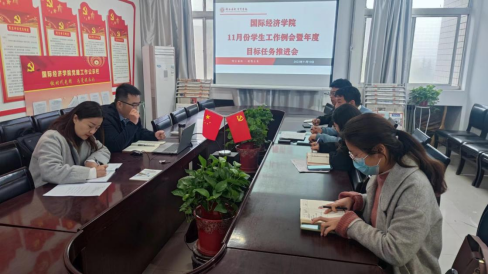 2022年11月10日上午,国际经济学院党总支副书记荣超主持召开11月份学生工作例会暨年度目标任务推进会,传达落实学校学生工作会议精神,推进学管年度目标任务工作落实。