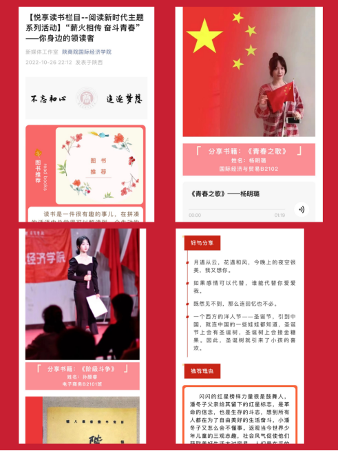 ——举办悦享读书栏目“薪火相传 奋斗青春”——你身边的领读者”主题活动。为深入推动大学生全民阅读,赓续红色血脉,展现大学生的时代风采和昂扬斗志。由学院悦享ING读书栏目指导的“薪火相传 奋斗青春”大学生阅读主题系列活动于10月启动。此活动重点结合党史学习教育,围绕“薪火相传 奋斗青春”的活动要求,组织“奋斗的青春最美丽”大学生读书分享会,以“热爱读书、改变命运”为目的,树立热爱阅读的大学生为典型,让他们讲述阅读的收获,充分展现当代大学生通过阅读、学习改变人生命运的重要性。