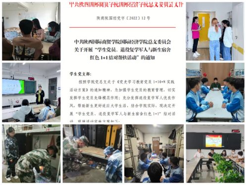 ——举办“学生党员、退役军人与新生宿舍1+1结对共建活动”。通过活动举办充分发挥学生党员先锋模范作用、发挥退役复学军人过硬作风,帮助新生更好适应大学生活。在结对共建中,加强党建引领,在新生中宣传党的基本理论,弘扬爱国主义精神;开展互动学习,激发学习动力,明确学习目标;引导优良学风建设,营造积极向上的学风氛围;促进文明宿舍建设,指导新生做好宿舍内务卫生建设,提升集体宿舍人员公德意识,协助开展好寝室文化建设,引导新生建设温馨、和谐、向上、进取的宿舍环境;及时反馈和化解矛盾,通过定期走访对接宿舍,摸排新生思想动态,及时向辅导员反馈宿舍异常情况,帮助异常学生稳定思想,化解矛盾。