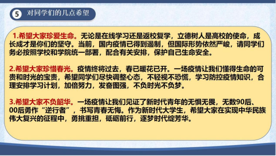 最后同学们纷纷表示,聆听了贺老师的开学第一课,更加明确了自己的初心和使命,作为新时代的青年大学生,要扎实学好专业知识,把个人的理想追求与国家民族的命运紧密结合起来,争做堪当时代重任的时代新人和中国特色社会主义事业的接班人。