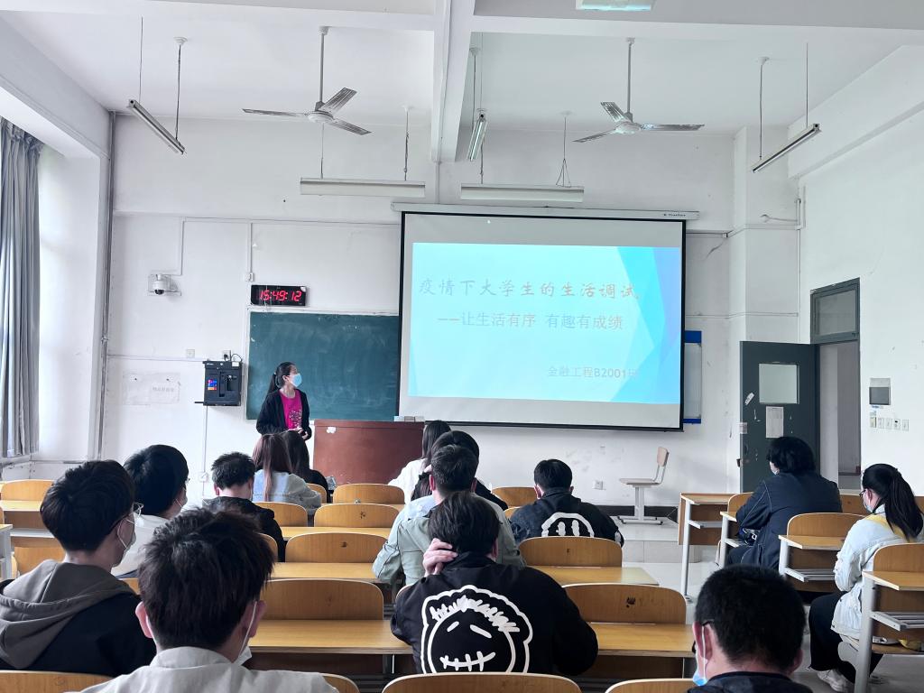 为扎实落实学校疫情防控政策,引导学生严格遵守疫情防控要求,以正确的心态应对疫情,学会疫情期间心理调适方法,有针对性的进行防疫心理疏导,提升学生心理素质。国际经济学院2019级、2020级各班于4月21日下午召开疫情下大学生的自我调适——让生活有序有趣有成绩主题班会。