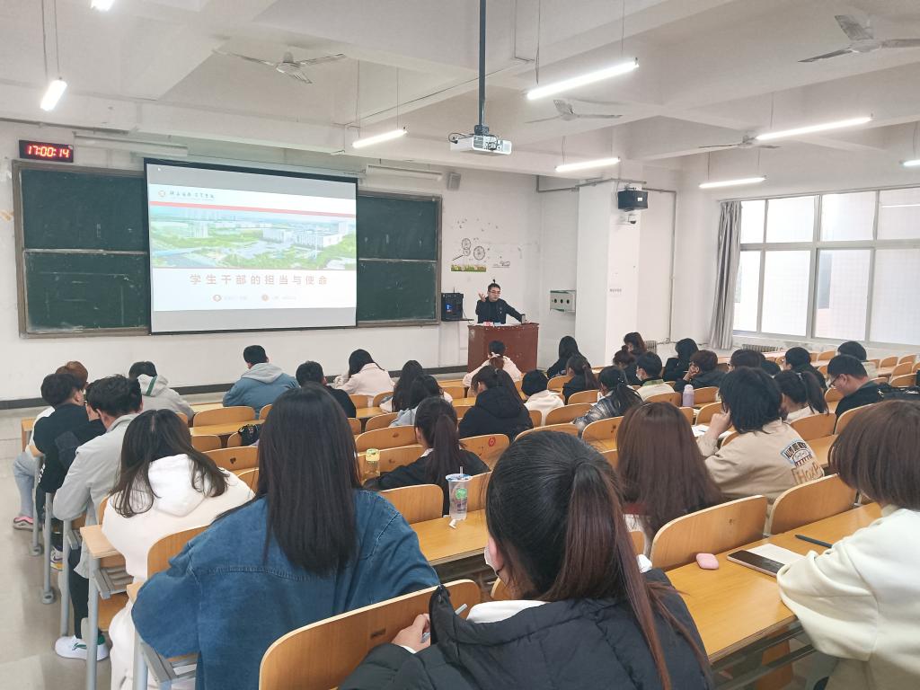 荣老师以《学生干部的担当与使命》为主题,结合学院学生干部实际,从“合理规划大学生活,充实大学时光”及“发掘潜力,珍惜平台,成就自我”两个方面做了培训,他从学生干部竞聘的“初心”谈起,要求新任学生干部要珍惜大学时光,科学规划学业目标,努力提升学业水平,用身份约束行为,用学业水平验证身份,让学生干部真正成为优秀学生的代表。在提升学生干部作用发挥中,他指出:学生干部要在参与管理和服务同学中,要满怀激情、活动开展上要勇于创新、要工作投入,执着细节、要敢于面对困难和挫折,就团学组织如何加强内部管理,提高组织凝聚力,提升学生干部政治敏锐性,及时发现和反馈苗头问题等提出了方法建议。