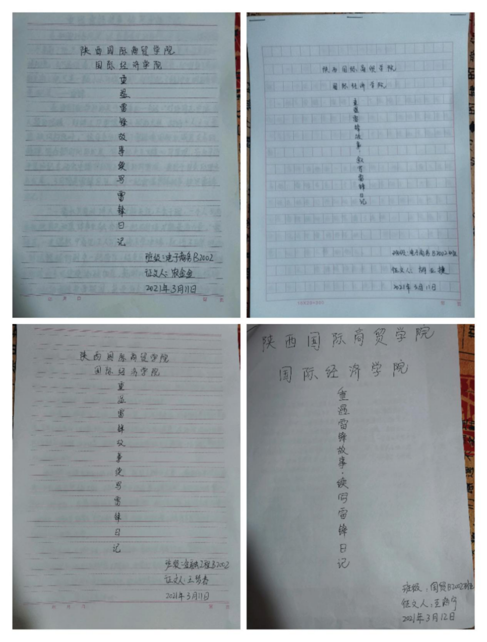 ——开展“学雷锋”主题征文活动。为激励同学们进一步研讨雷锋精神本质,国际经济学院组织开展了“学雷锋,树新风”主题征文活动。全院学生纷纷积极响应,不仅用真挚的情感书写了各自内心对雷锋同志的敬佩之意,还畅谈对雷锋精神本质的深入理解。通过征文活动充分展现了国际经济学院学子的积极向上的精神风貌,将雷锋精神内化于心。
