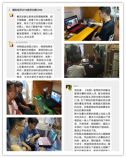 2020年5月25日,国际经济学院2018级辅导员李彤辉组织2018级全体同学,在线观看了韩国电影《流感》,这部韩国灾难性电影引发全体同学的热议,相似的剧情如同预言般让众多当初宅在家里的我们趋之若鹜。人物形象的鲜明与矛盾,流感降临城市时人们的恐慌不安以及剧情的跌宕起伏、场面的震撼冲击给我们留下了不可磨灭的印象。