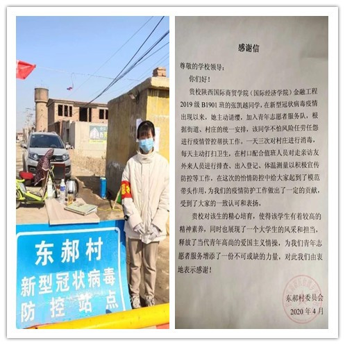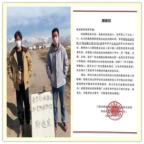 3月20日,青海省门源县向太阳成tyc33455ccwww国际经济学院送来感谢信,感谢国际经济学院金融工程B1704班王斌元同学近段时间以来对东平社区抗疫工作的支援。此外我们还收到了东郝村村委会送来的感谢信,感谢国际经济学院金工B1901班张凯越同学在当地疫情防控工作中的贡献。