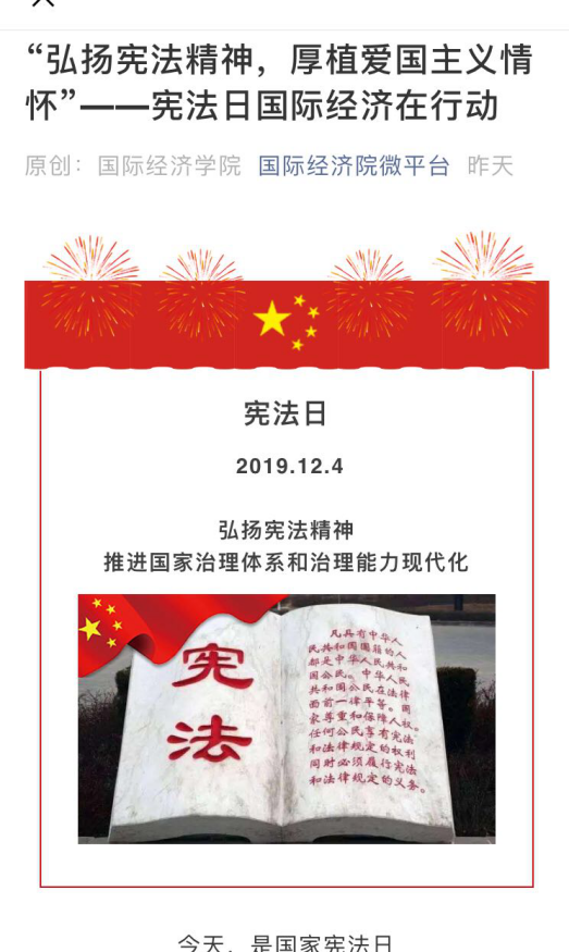为认真贯彻教育部和省厅关于深入学习宣传和贯彻实施宪法的有关精神,落实好学校有关宪法学习工作安排,使当代大学生更好的学习宪法知识、弘扬宪法精神,厚植大学生爱国主义情怀,2019年12月4日,国际经济学院团总支组织各班支部开展“弘扬宪法精神,厚植爱国主义情怀”的主题团日活动。