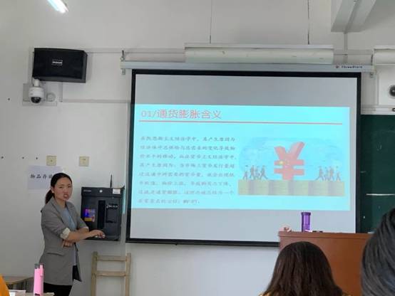 课堂上,各位同学通过PPT积极展示各组的课后研究成果,从通货膨胀的含义,通货膨胀的衡量标准,以及通货膨胀的影响等方面对课题进行了讲解。每组展示后,老师都对每组的探究结果进行了提问,纠正和修改,保证每位同学都积极参与到活动中。