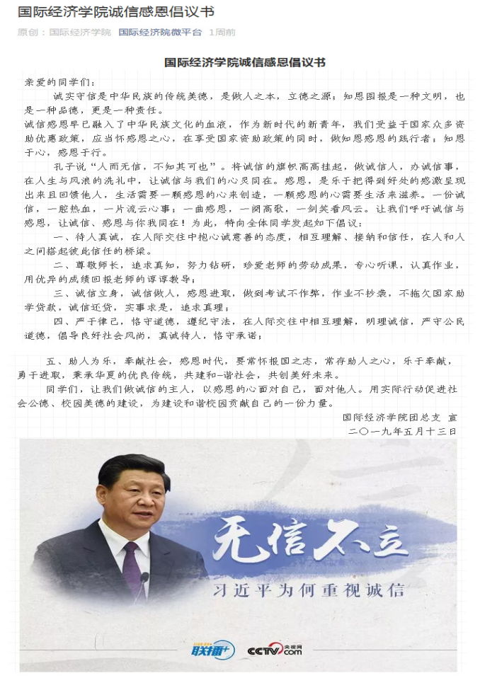 近期,国际经济学院在全院范围内开展诚信感恩教育活动助推资助育人工作,引导学生塑造诚信品质,树立感恩意识。