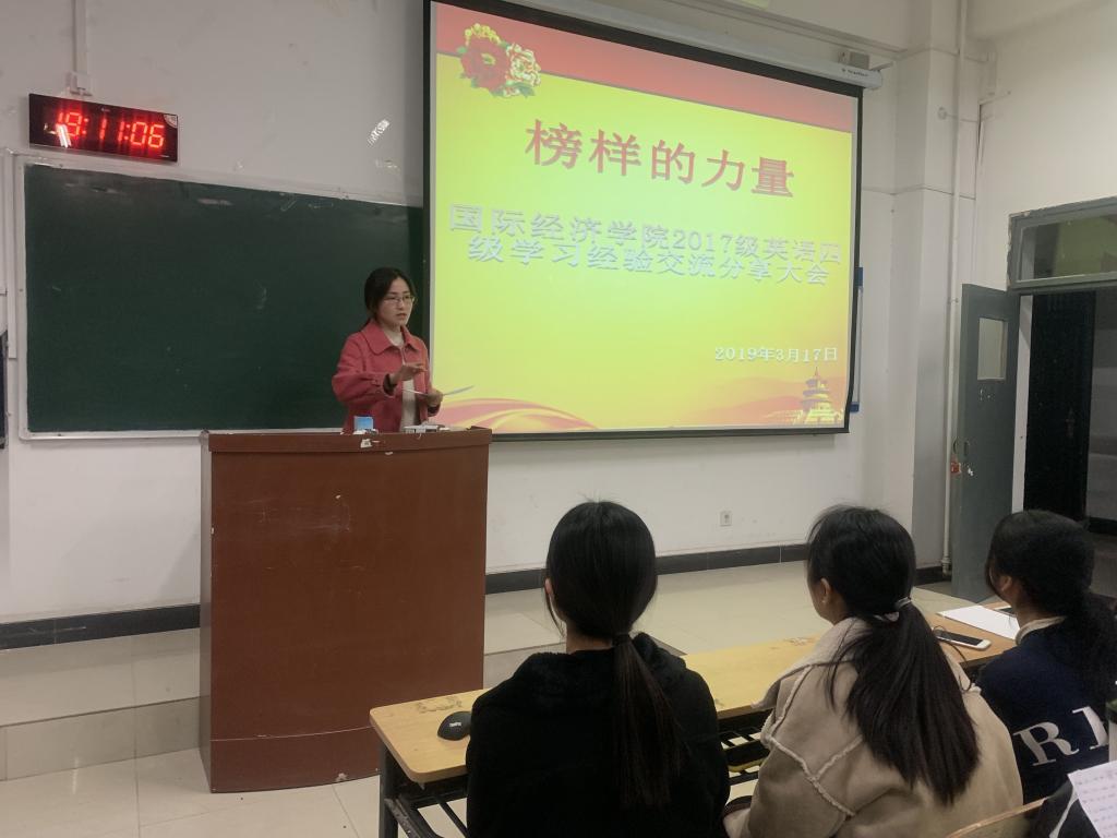 为进一步推进学院学风建设活动,有效提高学生积极备考英语四级考试。3月17日晚19:00,国际经济学院组织2017级学生在2J127教室举行英语四级学习经验交流会。本次交流会邀请了英语四级考试成绩优异的魏瑞洋、李逸青、岳永志和张思缘等四位同学分享了学习经验,活动由周亚朋同学主持。