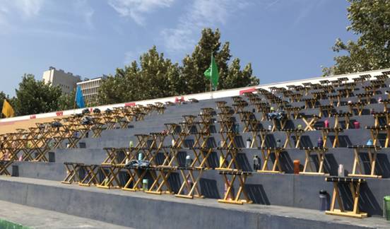 两侧的看台上,学生的马扎小凳水杯井然有序地排列着展现出军训高度的纪律性。