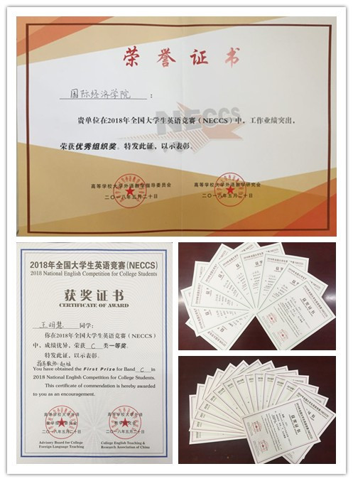近期,2018年全国大学生英语竞赛(NECCS)陕西省决赛成绩揭晓。经过初赛和决赛的激烈角逐,国际经济学院学子王明慧同学获得本届全国大学生英语竞赛C类一等奖;张靖媛等9名同学获得二等奖;任玉莹等15名同学获得三等奖;同时,学院荣获本次竞赛“优秀组织奖”。