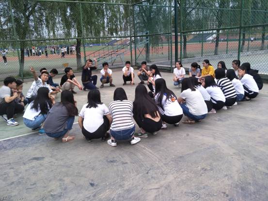 活动在形式多样的热身游戏中开展。通过团体"比长短"、"瞎子背瘸子"和"训练幽默和乐观情绪"三个环节进行,一是体验信息沟通,培养了大家的专注性和领导力,出错的同学接受大家的特别"惩罚";二是考验大家的沟通技巧,同学们被平分成若干组进行比赛,只用语言描述,来分辨方向,然后到达目的地,最快完成任务且没有任何排序错误的小组为胜利;三是学生把姓氏汉语拼音的首字母与之对应的动物名称喊出来,选择一个伙伴(一位不太熟悉的作为伙伴),彼此盯着看,目光不能转移,培育学生在最困难的时候,不能忘记幽默可以使你保持乐观。
