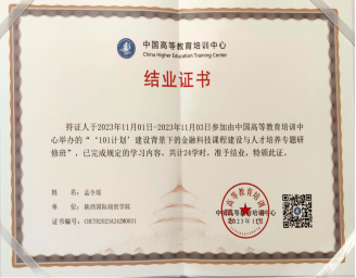 2023年11月1日-3日,“101计划“建设背景下的金融科技课程建设与人才培养专题研修班在江苏省南京市正式开班,本次活动由中国高等教育学会指导、中国高等教育培训中心主办、深圳希施玛数据科技有限公司承办。国际经济学院金融教研室主任李梦娜老师、孟令瑶老师参加了本次专题研修。