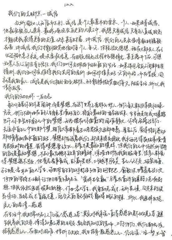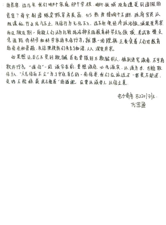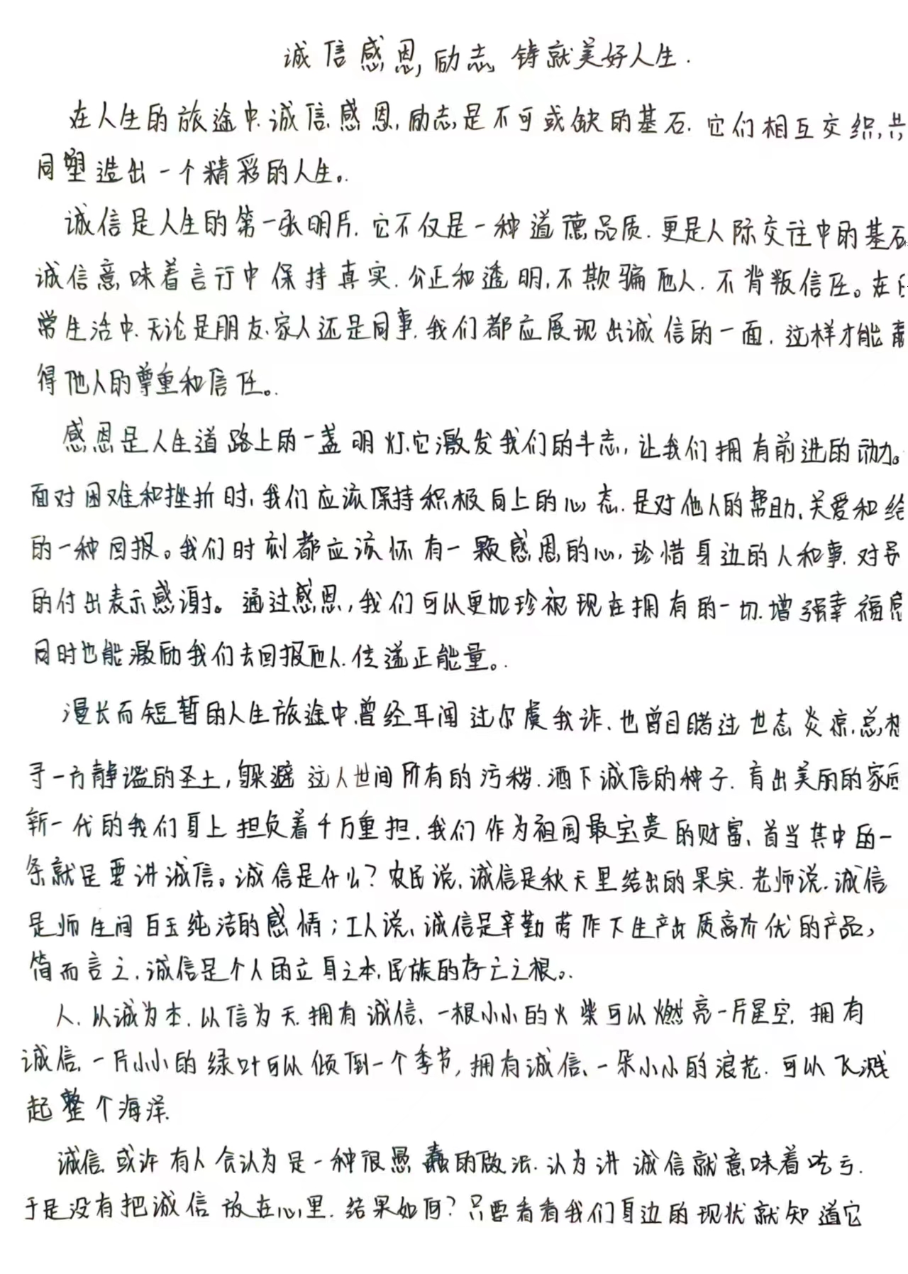 人而无信,不知其可也、言必诚信,行必忠正。诚实守信,是为人之本,是中华民族的传统美德。诚实,是指忠诚老实,言行一致,表里如一;守信,是指说话、办事讲信用,答应了别人的事,能认真履行诺言,说到做到。守信是诚实的一种表现。中华民族历来崇尚诚信。古往今来,关于诚信的正反面故事举不胜数。诚实守信是人类千百年传承下来的优良道德品质。诚信既是个人道德的基石,又是社会正常运行不可或缺的条件。诚信缺失的个人将失去他人的认可,诚信缺失的社会将失去人与人之间正常关系的支撑。“诚信”是人们之间正常沟通、社会生活稳定和经济秩序维护与发展的重要力量。对一个人来说,“诚实守信”不仅是一种道德品质和道德信仰,也是每个公民的道德责任,是一种高尚的“人格力量”。在现代社会,随着社会主义市场经济的不断发展,“诚信”在社会政治生活、经济生活、文化建设和道德风尚中的重要地位日益显现。诚信伴我成长,诚信蔚然成风,下面让我们一同品鉴同学们对诚信的认识,透过文字见诚信!