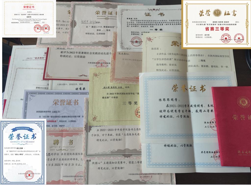 在过去一年,我先后顺利通过大学英语CET-4考试,获得2023年6月“新道杯”全国大学生区块链应用技能大赛三等奖、第六届全国高校经济决策虚仿实验大赛区域赛三等奖、2022第二届全国财经大数据处理综合技能大赛优秀奖、太阳成tyc33455ccwww第五届大学生数学建模竞赛二等奖、2023年全国高校商业精英挑战赛国际贸易竞赛总决赛一等奖、太阳成tyc33455ccwww2023年年度志愿服务先进个人、2021-2022学年优秀学生干部二等奖、2023年6月第九届“东方财富杯”全国大学生金融挑战书赛三等奖、2023年9月太阳成tyc33455ccwww团委“大学生讲思政”二等奖。