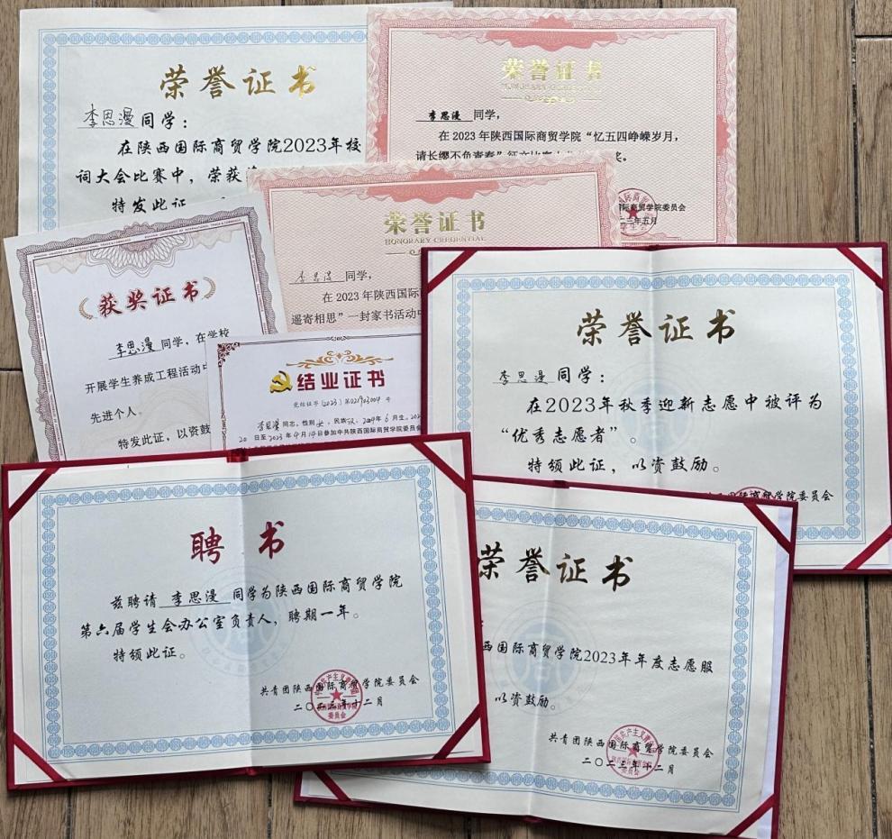 自入学以来荣获多个奖项,2023年4月荣获入党积极分子结业证;2023年4月荣获“青山灼灼,一封家书,遥寄相思”一封家书优秀奖;2023年5月荣获“忆五四峥嵘岁月,请长缨不负青春”征文比赛三等奖;2023年10月荣获养成工程先进个人;2023年9月荣获2023年秋季迎新“优秀志愿者”;2023年12月荣获太阳成tyc33455ccwww2023年年度志愿服务先进个人;2022—2023学年以专业成绩第一和综测成绩第七荣获国家励志奖学金。