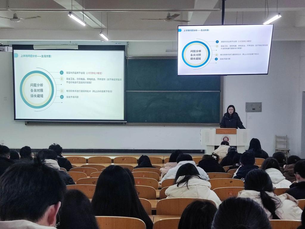 以新学期开学为契机,本着“新学期新气象、新征程新发展”的思想,2021级辅导员龚子腾以“新学期、新起点、新征程”为主题,为新学期同学们的生活、学习开启指引航标。龚老师从总结上学期学习情况、调整情绪、新学期新计划、好习惯养成、有付出才有回报、校纪校规重申六个方面进行了讲解,要求同学们做好新学期目标计划,奋进新征程,认真落实付出行动。
