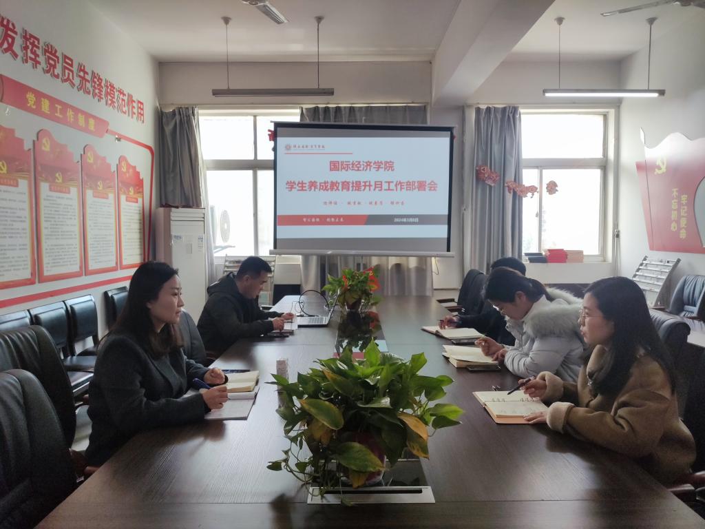 为巩固优良学风,规范学生行为,以更好的精神状态迎接审核评估工作,国际经济学院积极落实校学生处《学生养成教育提升月实施方案》,于3月8日上午9点召开了养成教育月工作部署会。会议由学院党总支副书记荣超主持,学生科干事常伟及各年级辅导员全体参会。