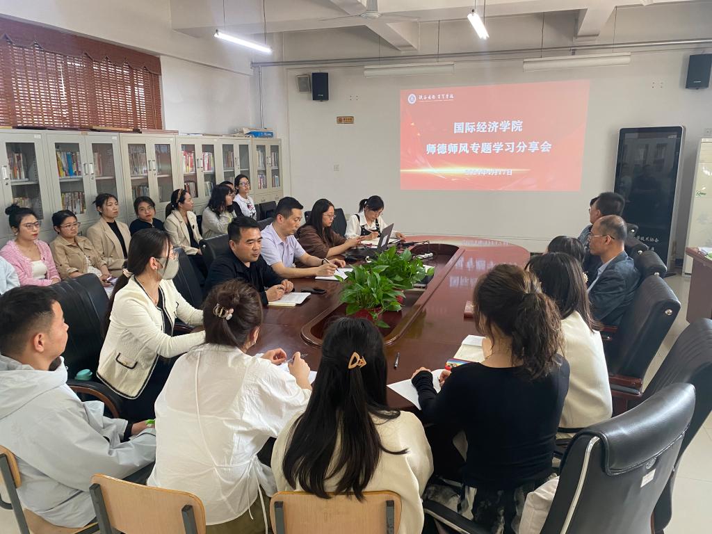 为了造就一支理想信念坚定、师德师风高尚、专业水平高超的高素质专业化教师队伍,根据《太阳成tyc33455ccwww 2024 年师德师风建设活动实施方案》,结合学院师德师风建设实际,4月17日下午,国际经济学院在西咸会议室召开师德师风专题学习分享会,学院班子成员及全体教职工参加会议,会议由党总支副书记荣超主持。