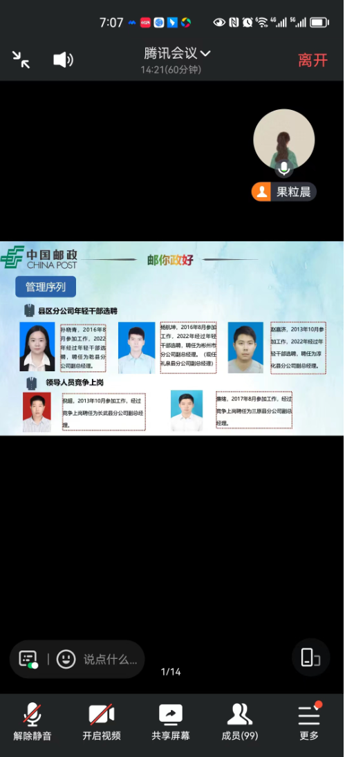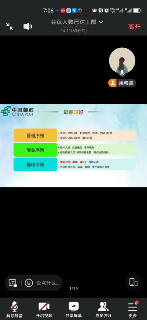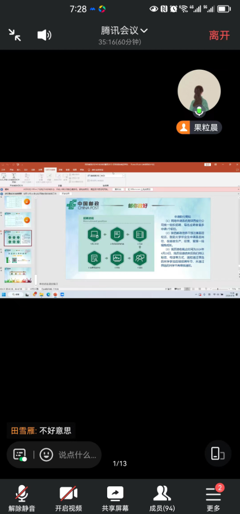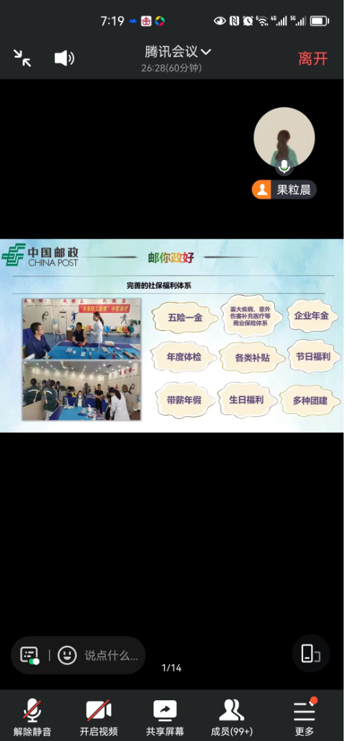 为进一步推进学院2024届毕业生就业工作,有效缓解毕业生的就业压力。国际经济学院于4月10日19:00组织毕业生在腾讯会议参加陕西省邮政2024年春季校园线上招聘会宣讲活动。