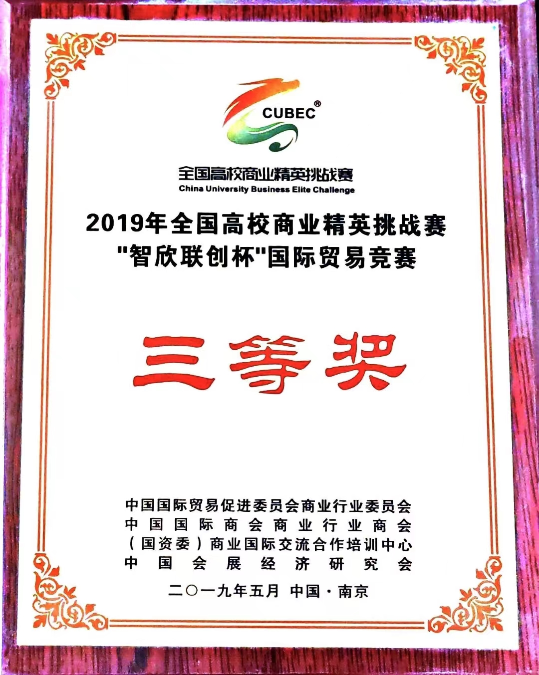 2019年全国高校商业精英挑战赛“智欣联创杯”国际贸易竞赛三等奖