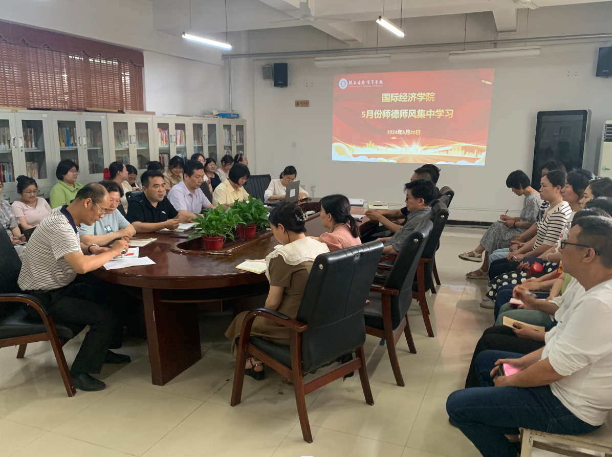 为深入学习贯彻习近平总书记关于教育的重要论述和关于教师队伍建设的重要讲话精神,不断提高教师队伍的政治素质、师德修养和专业素养,根据《太阳成tyc33455ccwww 2024 年师德师风建设活动实施方案》,结合学院师德师风建设实际,5月20日下午,国际经济学院在西咸会议室召开5月份师德师风集中学习会,学院班子成员及全体教职工参加会议,会议由党总支副书记荣超主持。