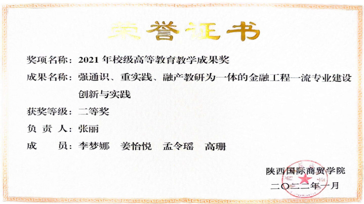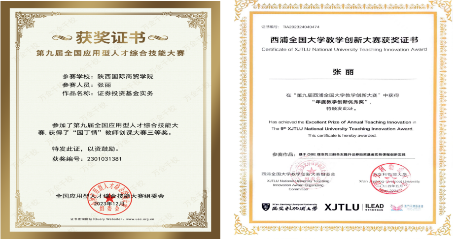 自任职以来,该教师主要承担《公司金融》,《证券投资学》,《证券投资基金实务》等课程,发表论文10余篇,其中核心论文4篇,主持省部级课题2项,主持校级课题3项,主持校级一流课程2项,参与省部级课题4项,参与省级一流课程1项,参与教育部高教司产学合作协同育人项目1项。获省级教学成果奖二等奖1项,校级教学成果奖特等奖1项,校级教学成果奖二等奖1项。获得全国应用型人才讲课大赛二等奖1项,三等奖1项,获校级思政大练兵活动讲课比赛三等奖1项,第九届全国应用型人才大赛技能大赛国家级三等奖第五届全国高校混合式教学设计创新大赛国家级优胜奖第九届西浦全国大学教学创新大赛国家级优秀奖,获批数字贸易专业群产教融合校级教学团队,校级科技创新团队获得全国金融与证券投资模拟实训大赛二等奖、三等奖优秀指导教师6项,东方财富杯优秀指导教师1项;参与出版教材2部。