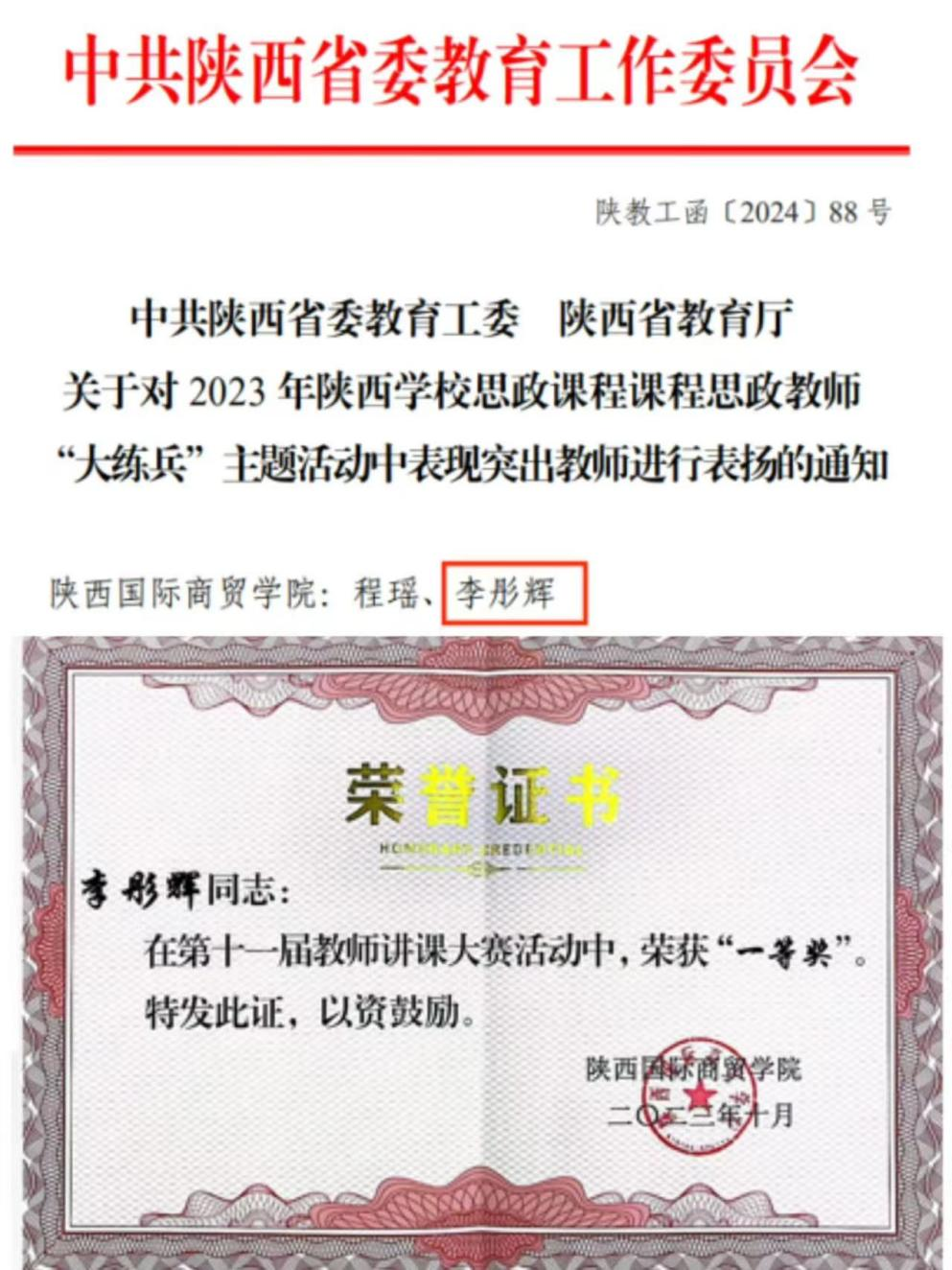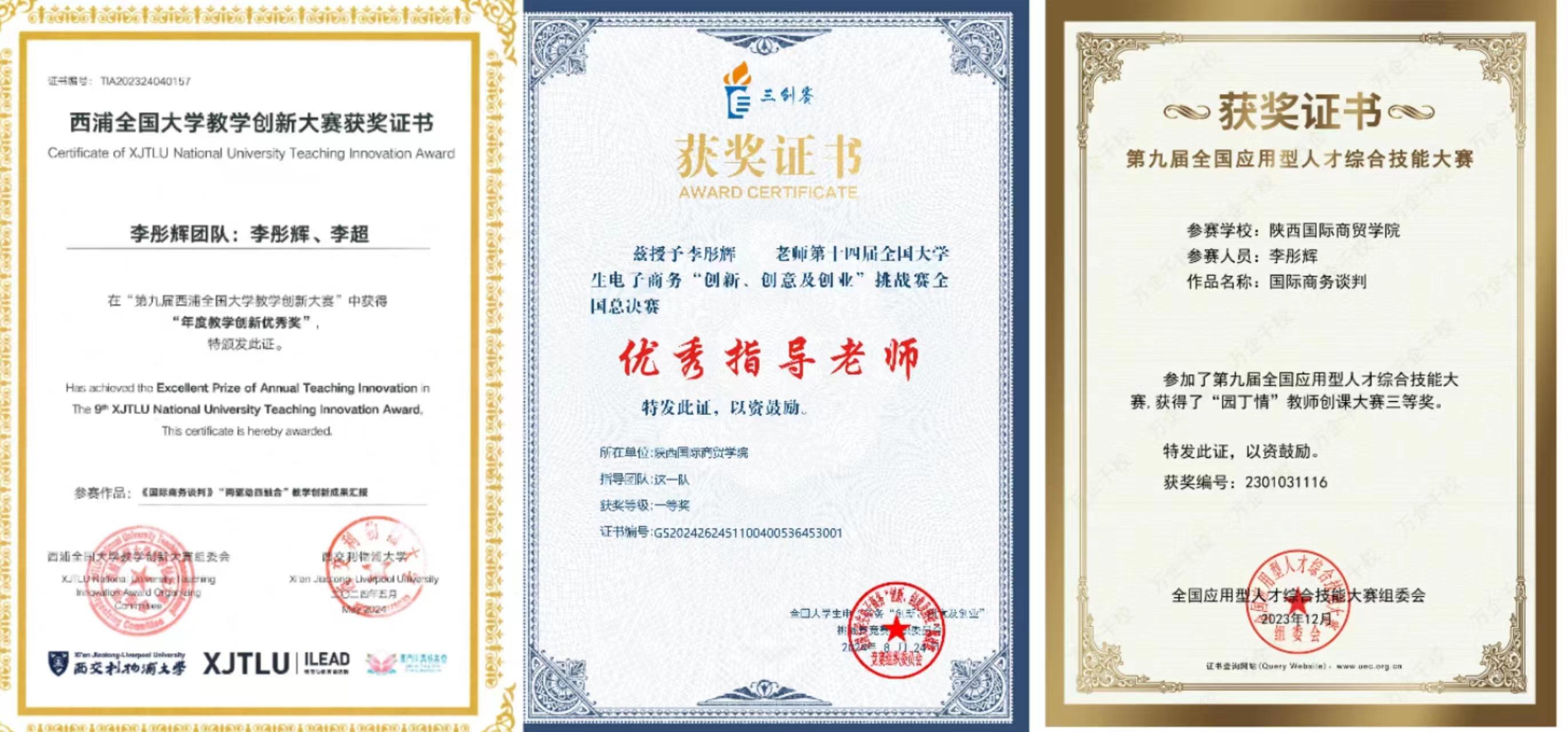 与此同时,她积极参加教学竞赛,以赛促教,以赛促改。2023年获陕西省课程思政大练兵“教学能手”称号,校级课教学创新大赛一等奖、第九届全国应用型人才技能大赛三等奖、2024年获第九届西浦全国大学教学创新大赛优秀奖等多项奖项。在竞赛中不断磨砺自己,精进课堂,自身教学能力得到一定提高。