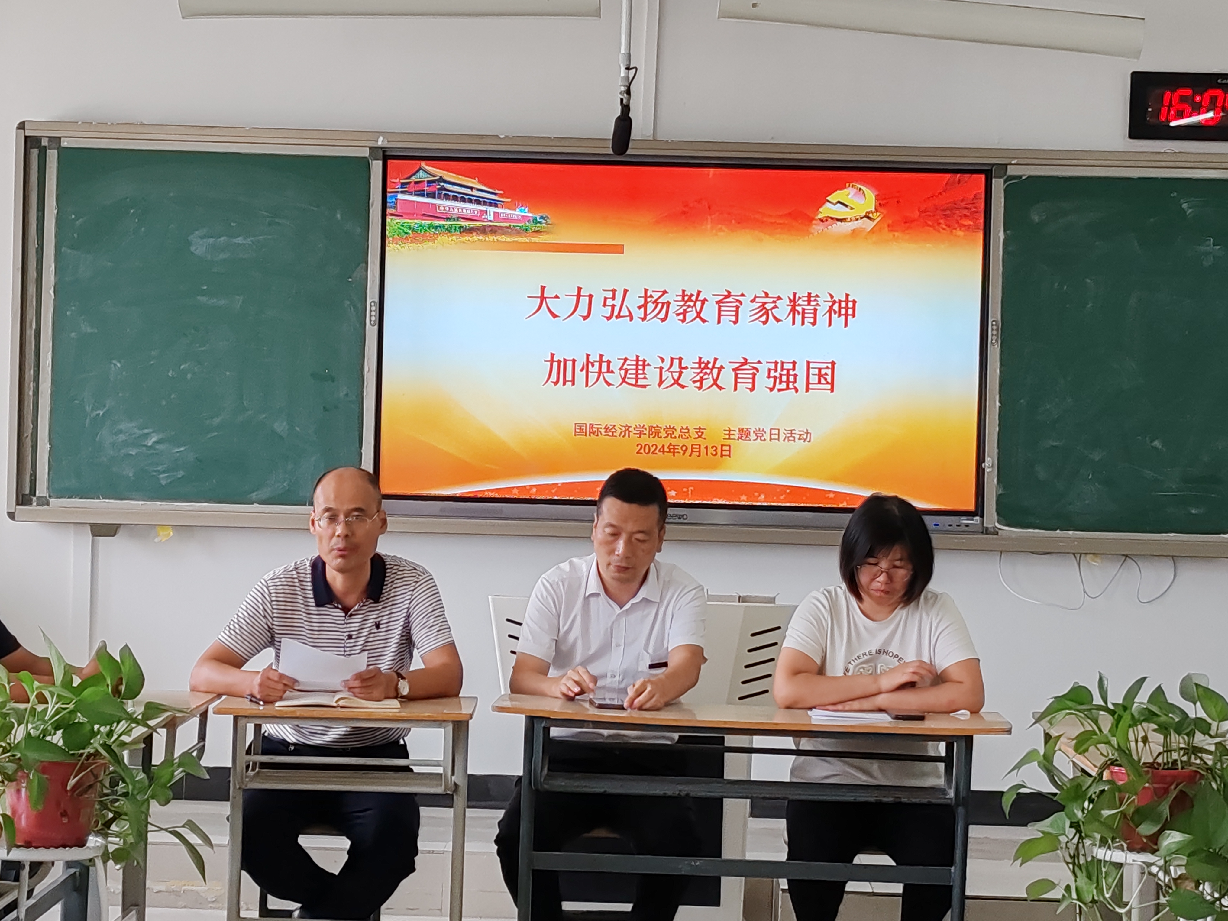 2024年9月13日下午,为深入学习贯彻落实党的二十大和二十届三中全会精神,大力弘扬教育家精神,国际经济学院教工党支部在2J417组织开展“大力弘扬教育家精神,加快建设教育强国”主题党日活动。活动由教工党支部副书记张艳主持,全体党员参加。