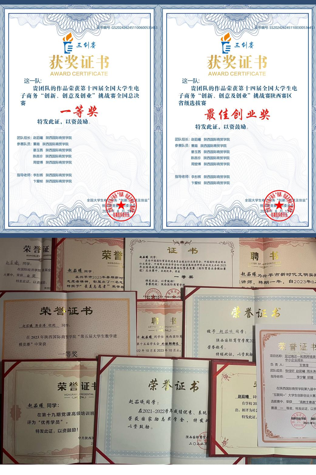 获奖经历:2024年8月荣获第十四届全国大学生电子商务“创新、创意及创业”挑战赛全国总决赛一等奖、陕西省一等奖及单项创业奖;2024年8月荣获中国国际大学生创新大赛(2024)陕西省铜奖;2024年6月荣获第十二届“挑战杯”陕汽集团陕西省大学生创业计划竞赛陕西省铜奖;2023年10月获全国商业精英挑战赛国际贸易竞赛一等奖;2023年获全国大学生数学建模竞赛陕西赛区一等奖;2024年5月荣获“第十期青年马克思主义者培养工程学习班暨大学生骨干培训班”优秀学员称号。2023年11月国际经济学院首届全国大学生职业规划大赛金奖;2021-2023年连续两年荣获国家励志奖学金;2023年7月荣获太阳成tyc33455ccwww“第五届大学生数学建模竞赛”一等奖;2023年4月荣获太阳成tyc33455ccwww第九届互联网+大赛高教主赛道一等奖;2022年12月荣获国际经济学院学生党支部知识竞赛一等奖。