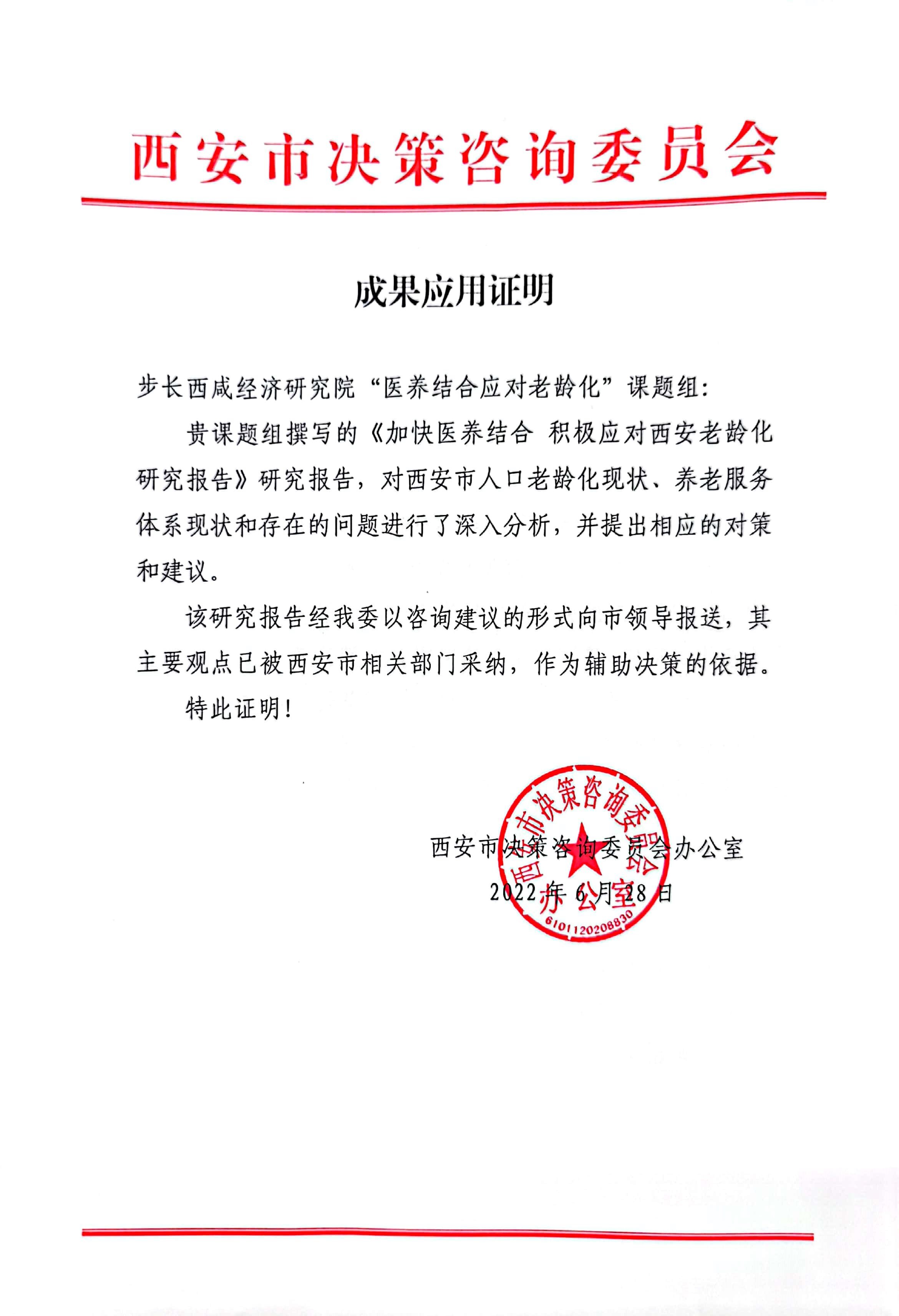 学院5项资政报告被西安市决策咨询委采纳应用,其中有3项涉及药商融合,具体包括:《关于通过养老补贴向需求方转变推动西安养老事业高质量发展的建议》、《关于推动西安社区、居家养老高质量发展的建议》、《加快医养结合 积极应对西安老龄化研究报告》3项研究报告被政府采纳。