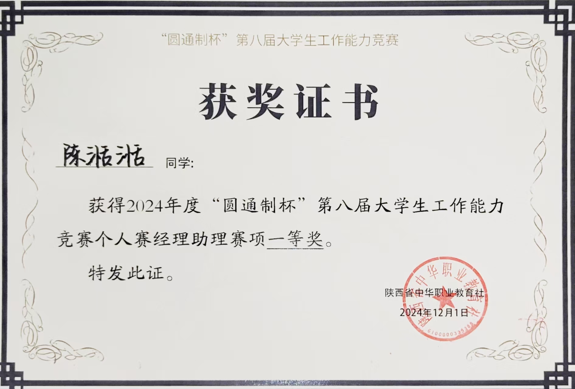 “圆通制杯” 大学生工作能力竞赛作为一项具有较高影响力的赛事,吸引了众多高校学子的积极参与。此次竞赛旨在提高大学生的工作实践能力,培养适应社会发展需求的高素质人才。12月1日,国际经济学院学生陈湉湉在 2024 年度 “圆通制杯” 第八届大学生工作能力竞赛个人赛经理助理赛项中脱颖而出,荣获一等奖。