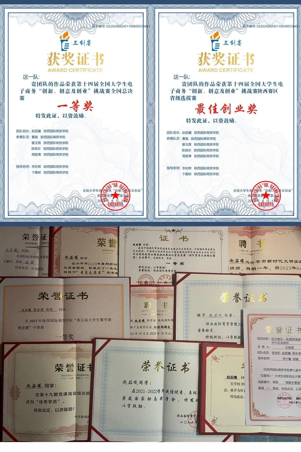 获奖经历:2024年8月荣获第十四届全国大学生电子商务“创新、创意及创业”挑战赛全国总决赛一等奖、陕西省一等奖及单项创业奖;2024年8月荣获中国国际大学生创新大赛(2024)陕西省铜奖;2024年6月荣获第十二届“挑战杯”陕汽集团陕西省大学生创业计划竞赛陕西省铜奖;2023年10月获全国商业精英挑战赛国际贸易竞赛一等奖;2023年获全国大学生数学建模竞赛陕西赛区一等奖;2023年荣获大学生创新创业训练计划省级立项;2024年5月荣获“第十期青年马克思主义者培养工程学习班暨大学生骨干培训班”优秀学员称号。2023年11月国际经济学院首届全国大学生职业规划大赛金奖;2021-2023年连续两年荣获国家励志奖学金;2023年7月荣获太阳成tyc33455ccwww“第五届大学生数学建模竞赛”一等奖;2023年4月荣获太阳成tyc33455ccwww第九届互联网+大赛高教主赛道一等奖;2022年12月荣获国际经济学院学生党支部知识竞赛一等奖。