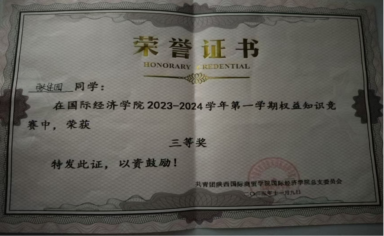 个人荣誉:“互联网+”大赛优秀奖,,大创赛优秀奖,权益知识竞赛三等奖。