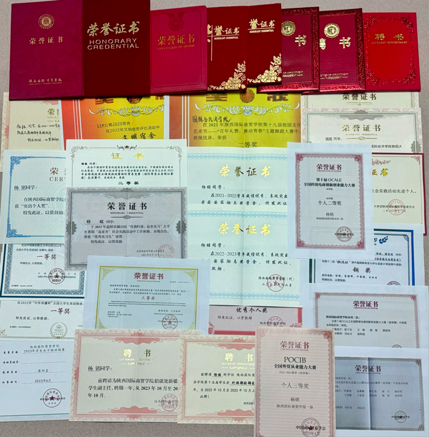 2021-2022年获国家励志奖学金;2022-2023年获国家励志奖学金;2023年8月获第九届中国国际“互联网+”大学生创新创业大赛省级银奖;2023年10月获全国高校商业精英挑战赛国际贸易竞赛总决赛二等奖;2024年6月获第十二届“挑战杯”陕汽集团陕西省大学生创业计划竞赛铜奖;2023年4月获第十二届POCIB全国外贸从业能力大赛(春季)团队及个人三等奖;2024年4月获第十届OCALE全国跨境电商创新创业能力大赛团队及个人二等奖;2023年6月获第六届全国高校经济决策虚仿实验大赛三等奖;2023年获“中外传播杯”全国大学生英语阅读大赛一等奖;2023年获“创新实践杯”全国大学生英语词汇竞赛一等奖;2023年8月在益阳市大学生暑期“返家乡”社会实践活动中获优秀实习生荣誉;2022年获暑期社会实践活动校级先进个人;2023年10月获校级突出个人奖;2023年6月获校级优秀个人奖 ;2022年9月获校级优秀个人奖。