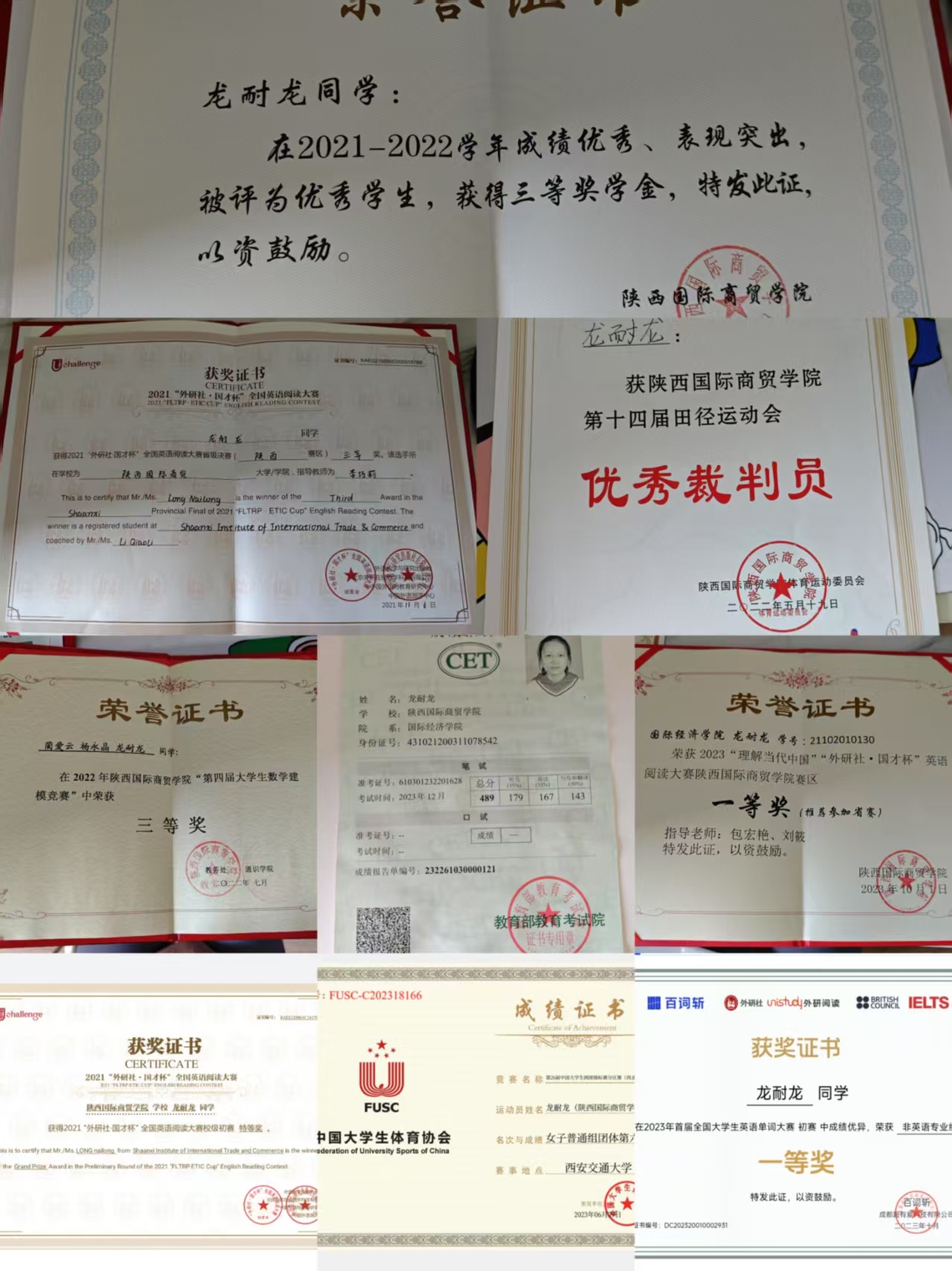 先后通过了英语四六级,在2024年5月获得了第27届中国大学生网球锦标赛(西北赛区)季军,2024年4月,获得了全国大学生英语能力竞赛三等奖,2024年4月,获得了POCIB全国外贸能力从业大赛二等奖,2024年10月,获得了第二届全国大学生英语单词大赛初赛一等奖,2023年10月获得“理解当代中国”“外研社国才杯”英语阅读大赛校赛一等奖,2023年6月,获得第26届中国大学生网球锦标赛(西北赛区)第六名,2023年11月,获得“理解当代中国”“外研社国才杯”英语阅读大赛省赛铜奖,2023年6月,获得第三届“外教社 词达人杯”全国大学生英语词汇能力大赛校赛一等奖,2023年4月,在校运会获得“优秀裁判员”称号,2022年12月,获得“优秀学生”,2022年7月,获得“第四届大学生数学建模竞赛”校赛三等奖,2022年12月获得“迎新杯”国际经济学院羽毛球比赛第三名等荣誉。