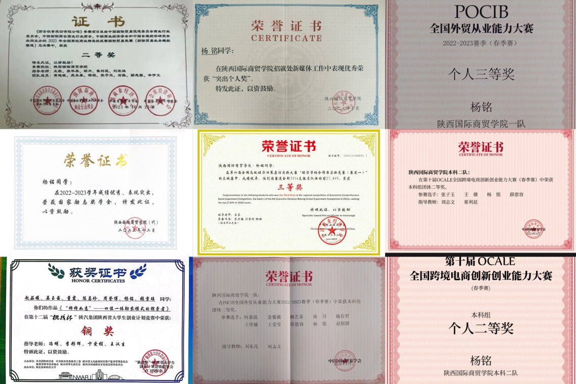 个人荣誉:2023-2024年国家奖学金,2021-2022年国家励志奖学金2022-2023年国家励志奖学金第九届中国国际“互联网+”大学生创新创业大赛省级银奖全国高校商业精英挑战赛国际贸易竞赛总决赛二等奖第十二届“挑战杯”陕汽集团陕西省大学生创业计划竞赛铜奖第十二届POCIB全国外贸从业能力大赛(春季)团队及个人三等奖第十届OCALE全国跨境电商创新创业能力大赛团队及个人二等奖第六届全国高校经济决策虚仿实验大赛三等奖“中外传播杯”全国大学生英语阅读大赛一等奖“创新实践杯”全国大学生英语词汇竞赛一等奖益阳市大学生暑期“返家乡”社会实践活动优秀实习生荣誉