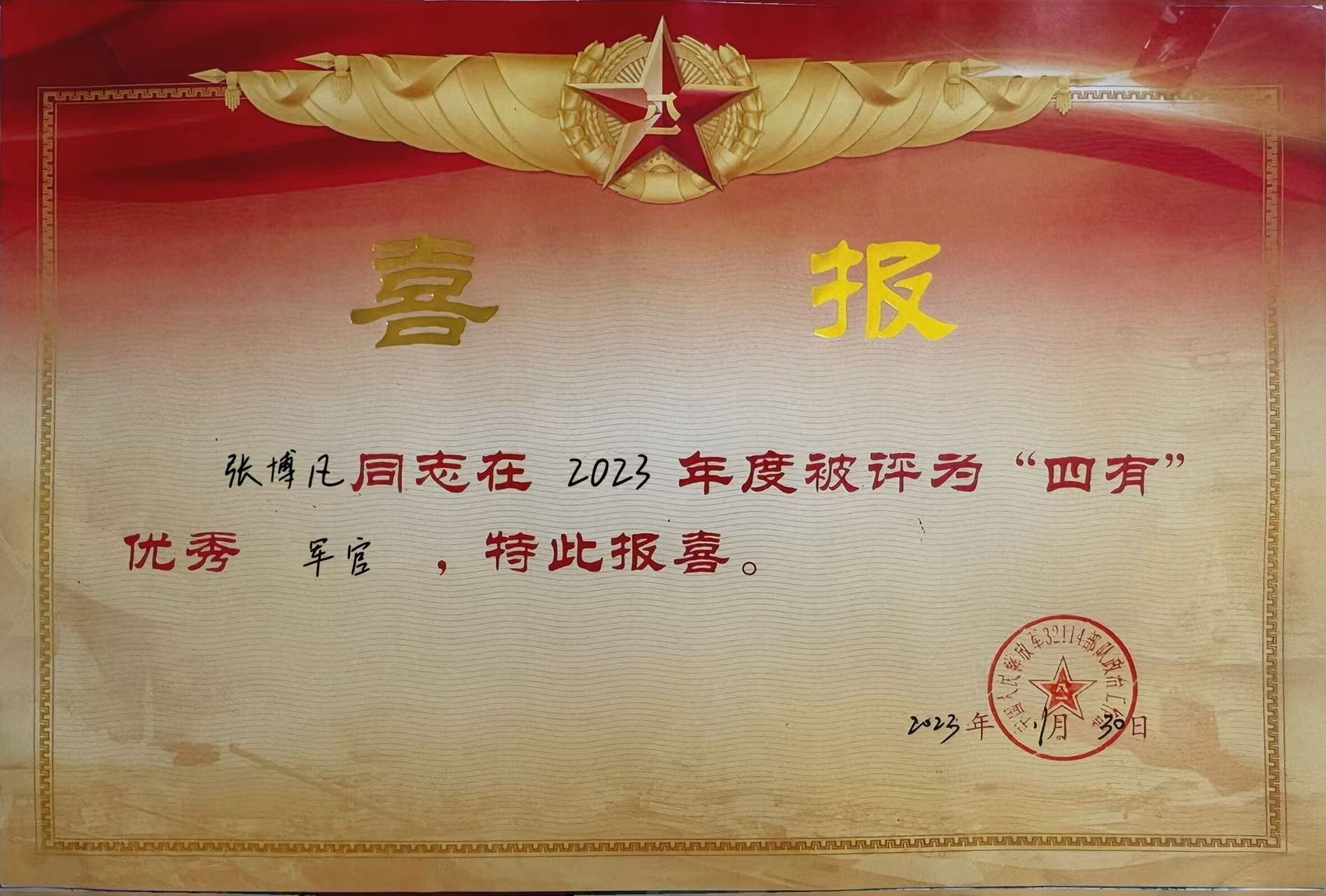 个人荣誉:2020年荣获军队科学技术奖(特等)、2023年被评为“四有”优秀军人。