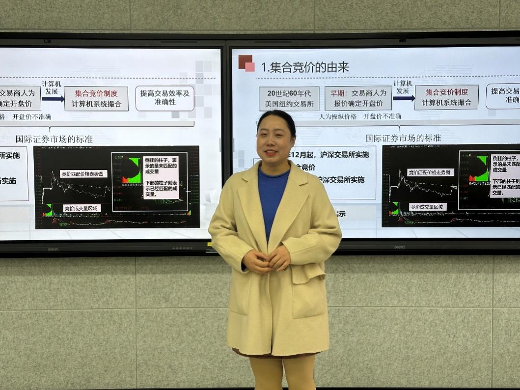 为深入贯彻落实全国高校思想政治工作会议精神,推进课程思政建设与专业教学深度融合,3月31日上午,国际经济学院孟令瑶老师在7教207教室开展《证券投资学》第五章"证券交易市场"课程思政示范课。本次示范课以"规范交易市场,服务实体经济"为主题,通过深入挖掘证券交易市场章节中的思政元素,实现了专业知识传授与价值引领的有机统一。