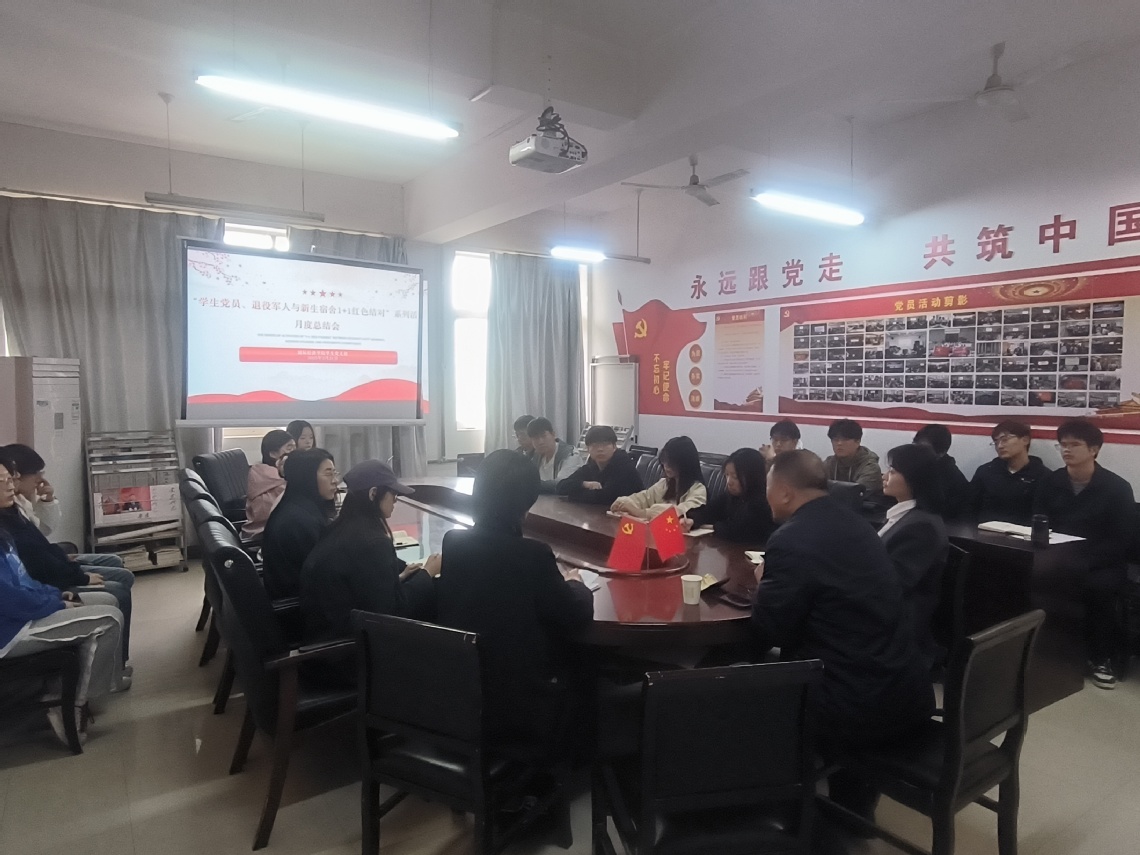 为深入推进抓党建促新生成长,着力提高学生党员与退役军人与新生宿舍1+1结对活动的创新性、趣味性,不断增强各学生党员、退役军人的责任意识和担当意识,3月31日下午国际经济学院学生党支部在党员活动室召开学生党员、退役军人“红色1+1”系列结对活动月度总结会。本次会议由结对活动的负责老师岳琪峰主持,党总支书记王彪书记、学生党支部书记常伟和结对新生宿舍的全体党员参会。