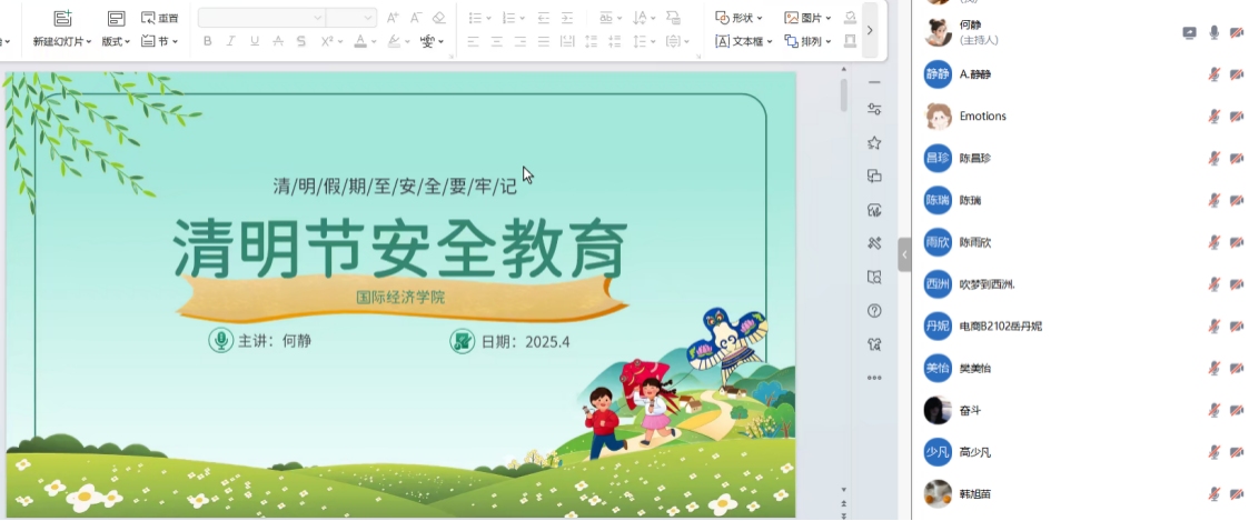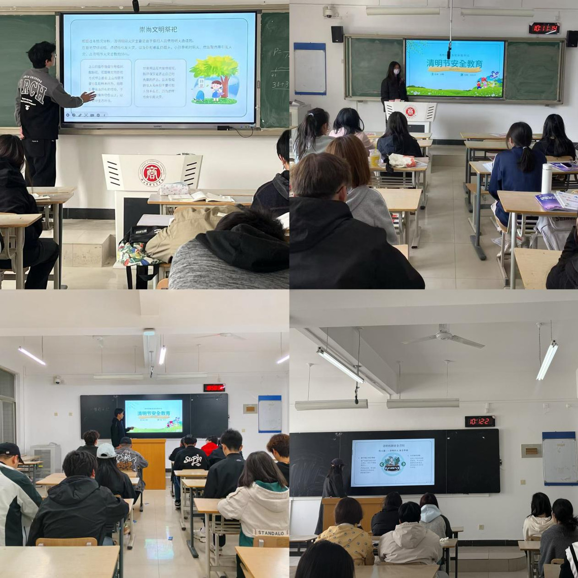 为增强学生的安全意识,预防安全事故的发生,确保学生度过一个平安、祥和的清明假期,2025年4月1日,国际经济学院各年级分别召开清明节安全教育班会,班会由各班班长主持,全班学生参加。