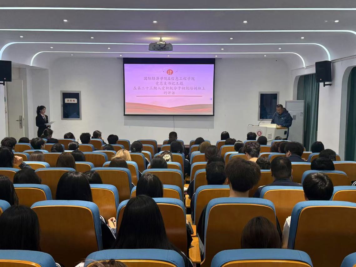 为深入学习贯彻习近平新时代中国特色社会主义思想,帮助入党积极分子端正入党动机,切实提高学院党员发展质量,4月7日—4月13日,国际经济学院&信息工程学院联合开展第二十三期入党积极分子初级党课培训,此次理论培训共分4天完成,两院党委书记王彪作为专题党课主讲人进行动员讲话,国际经济学院学生党支部书记常伟、国际经济学院24级辅导员分别授课,国际经济学院、信息工程学院共92名学员参与培训。