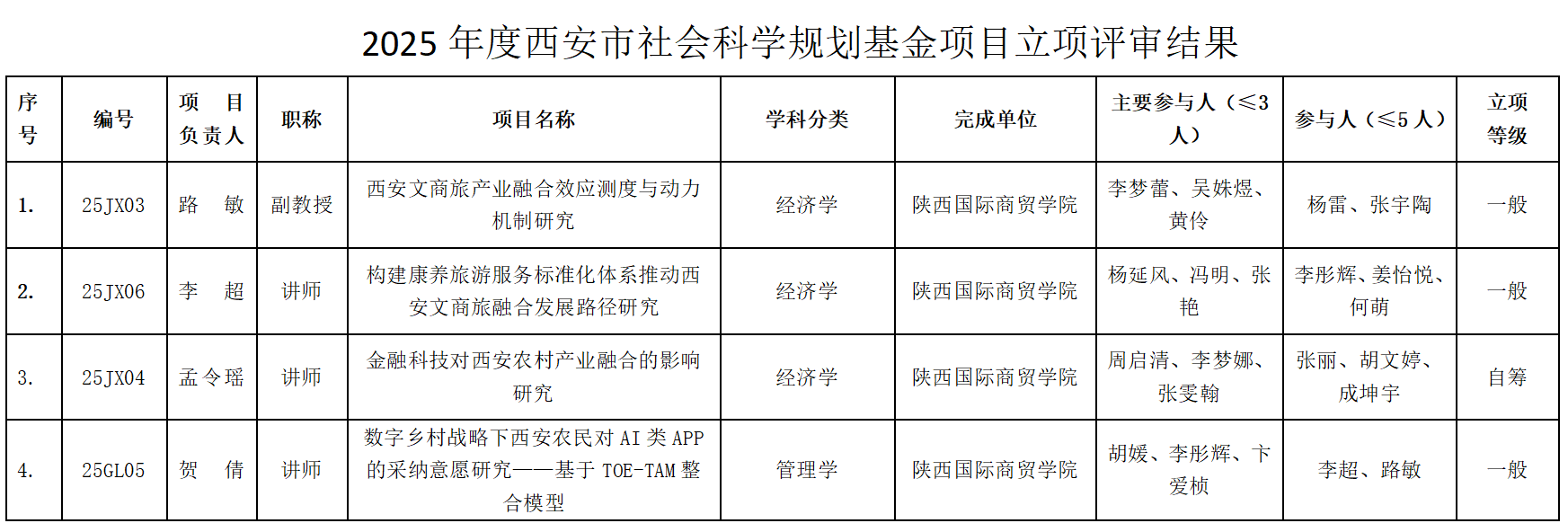 接西安市社会科学规划基金管理办公室《关于2025年度西安市社会科学规划基金课题立项的通知》文件,国际经济学院有4项立项。