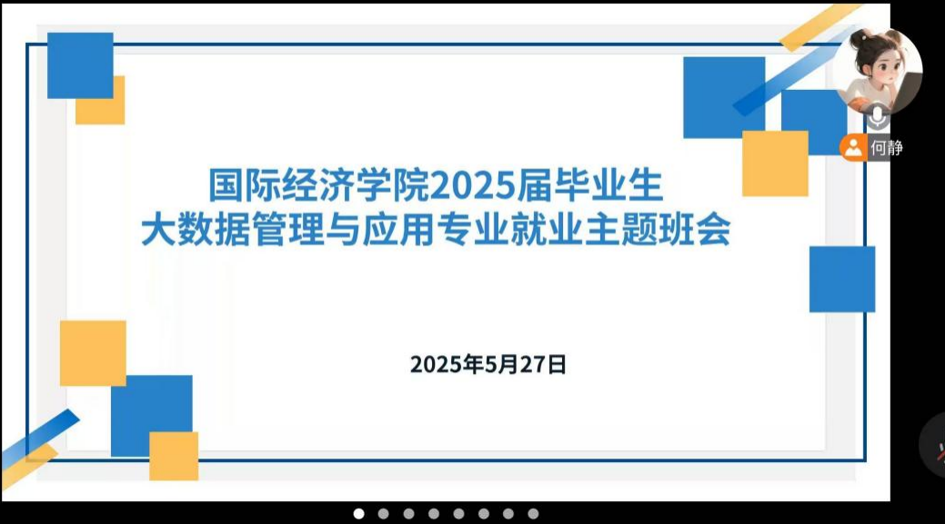 为护航2025届毕业生高质量就业,5月27日,国际经济学院通过腾讯会议召开大数据管理与应用专业就业主题班会,此次班会由辅导员何静老师主讲,毕业生参加。